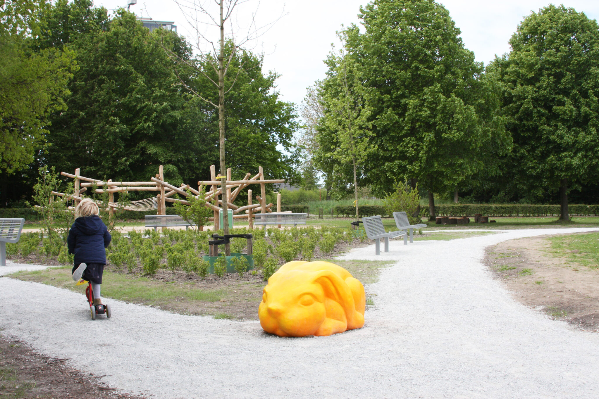 De zitplekken zijn op centrale plekken gesitueerd, dichtbij de entrees waar mensen elkaar ontmoeten en met zicht op de plekken waar de kleinste kinderen spelen. Met het oog op hete zomerdagen, zijn er voldoende zitplekken in de schaduw. Deze verblijfsplekken worden verrijkt met beplanting. Verder wordt de biodiversiteit verhoogd door een verscheidenheid aan bomen te planten. Verspreid door het park zitten oranje konijnen verstopt, deze zijn een extra spelaanleiding en dragen bij aan de herkenning van het park.