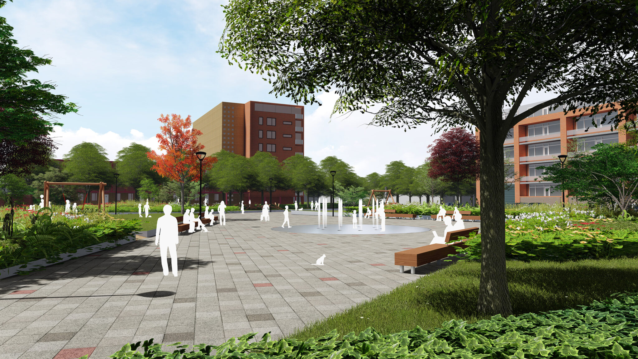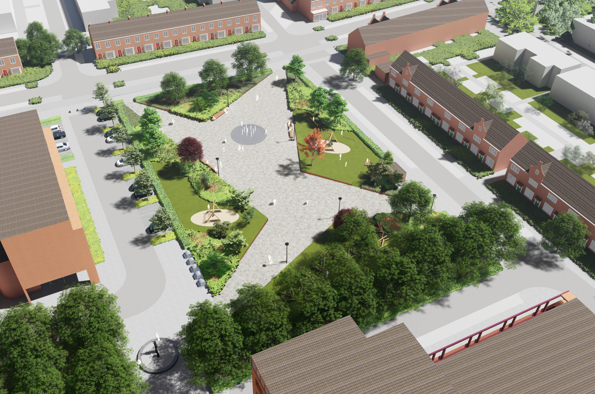 - Bedriegertjes centraal op het plein dienen als speelplek voor kinderen en als ideale plek voor verkoeling.