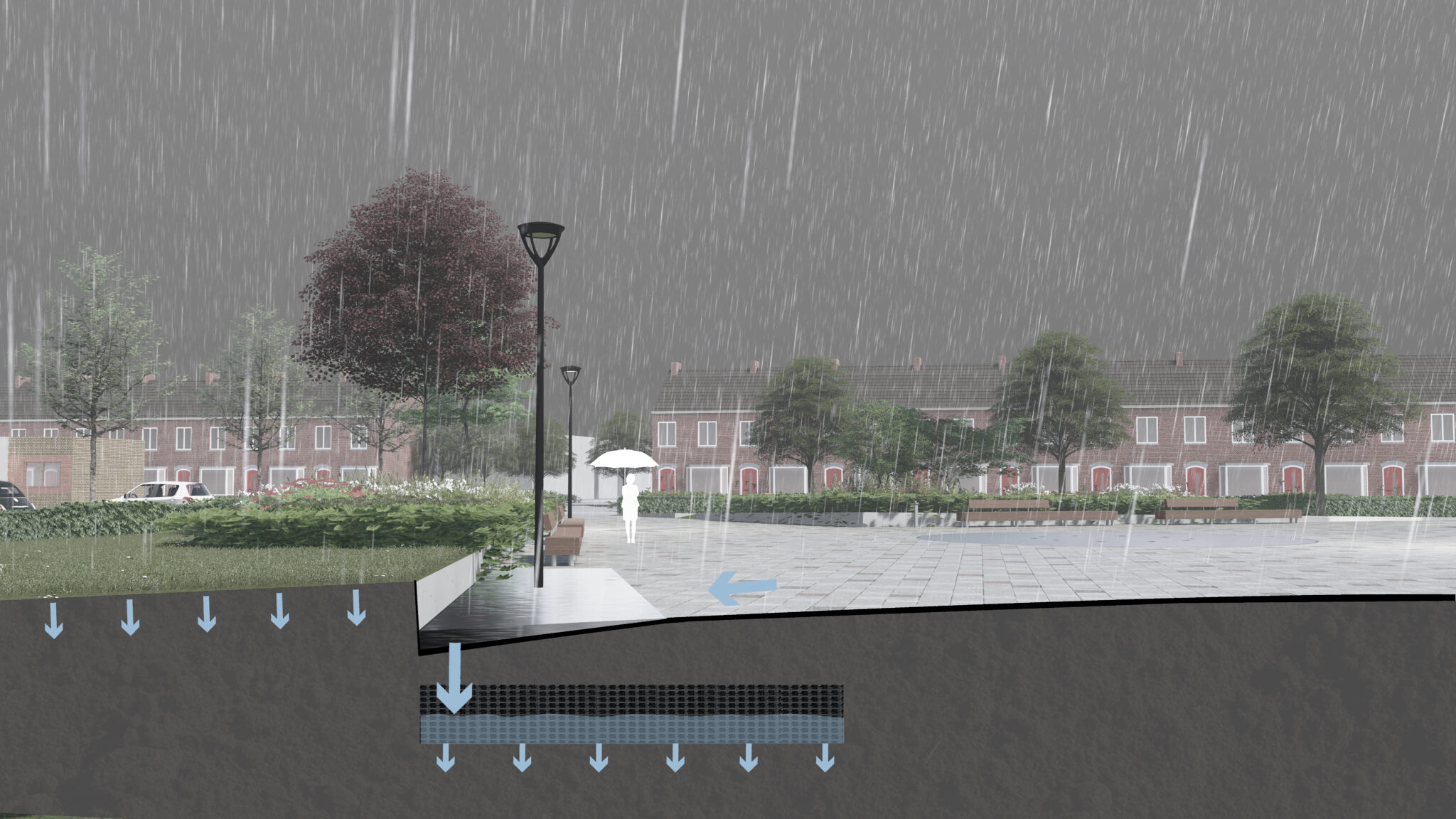 - Tijdelijke berging en geleidelijke afvoer hemelwater onder het plein door vergroening.