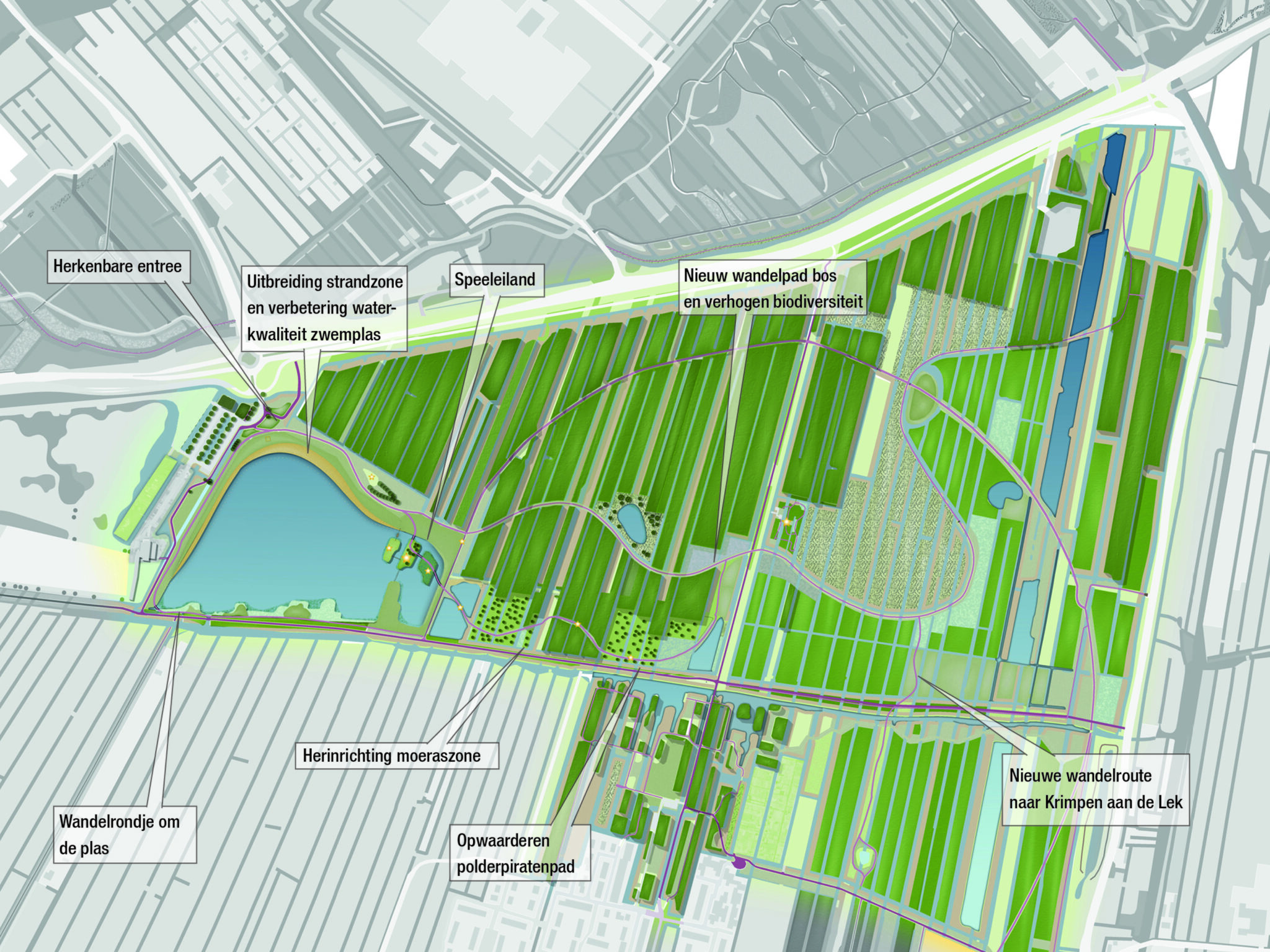 Beide locaties zijn uitvoerig onderzocht en geanalyseerd. Elke locatie heeft daaruit haar eigen pijlers om de beleving te verhogen. Voor de Krimpenerhout betekent dit bijvoorbeeld een herinrichting van de zwemplas.