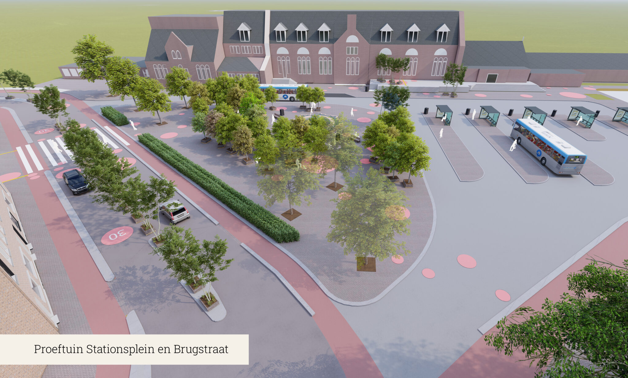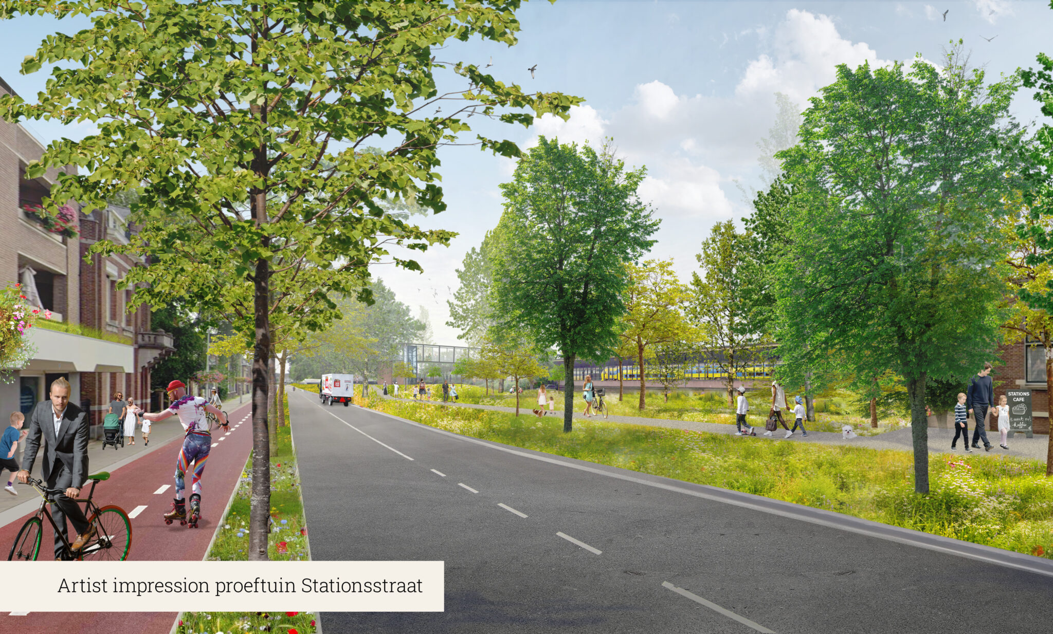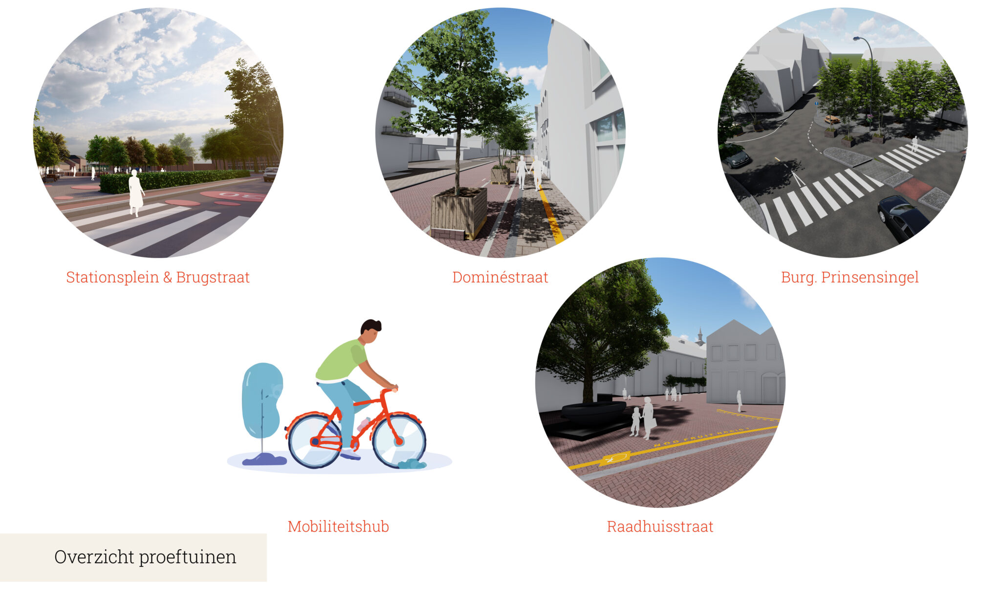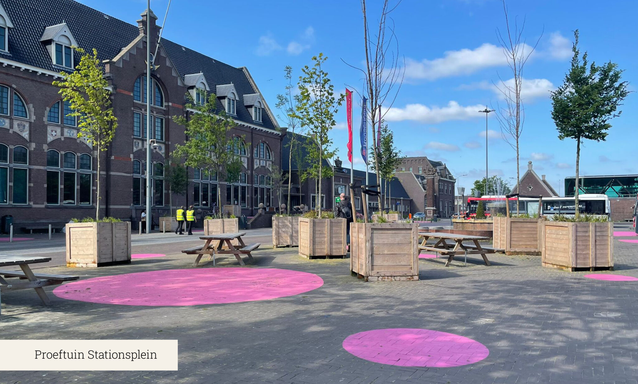 Enkele van de projecten en studies worden getest aan de hand van tijdelijke proeftuinen. Een voorbeeld is een proeftuin bij het Stationsplein, waar een groener, veiliger en klimaatadaptief plein wordt getest. Met behulp van boombakken wordt het plein minder stenig en roze stippen geven op de rijweg aan dat er op de snelheid gelet moet worden.