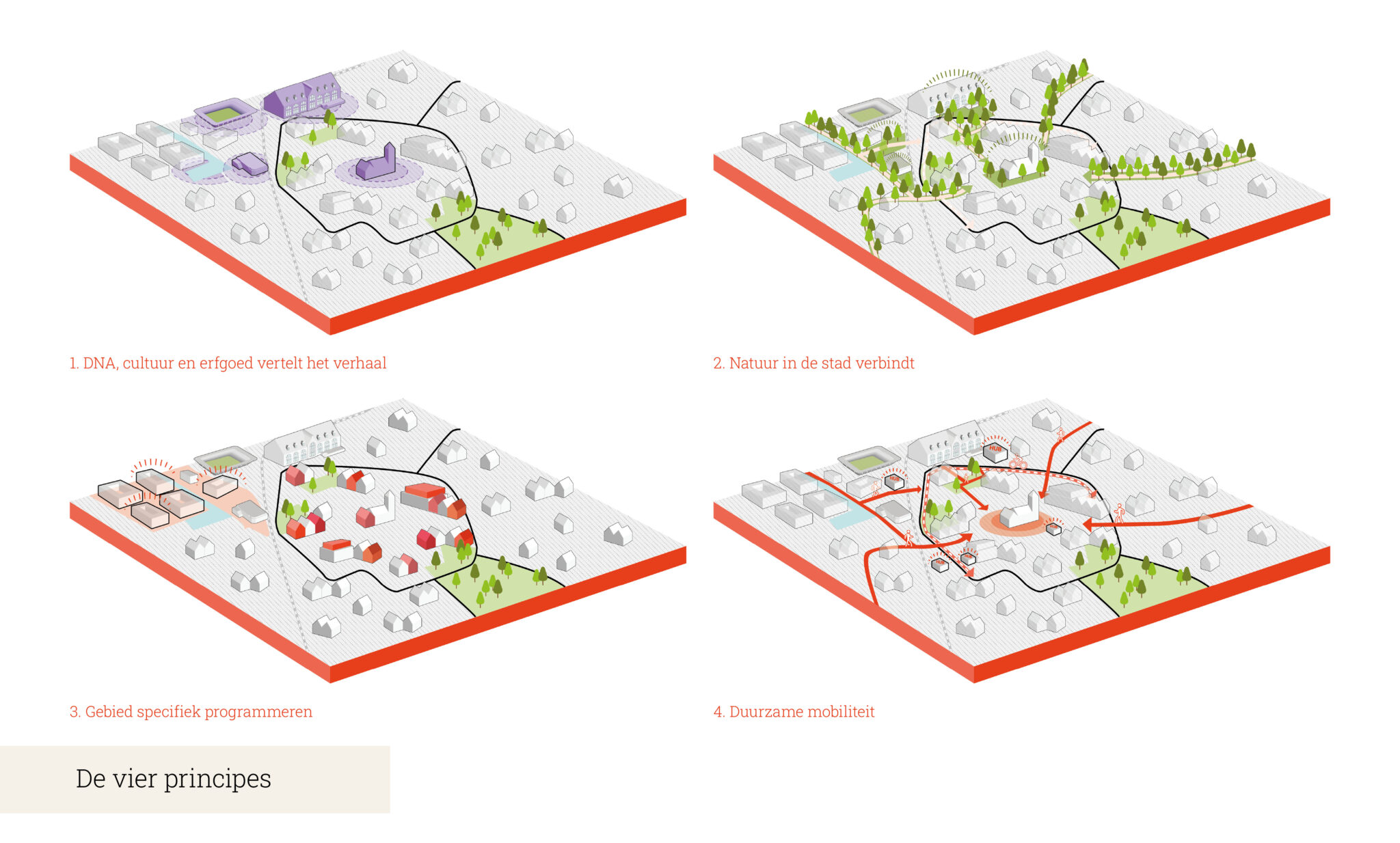 De principes (1) cultuur, erfgoed en DNA vertellen het verhaal en (2) natuur in de stad verbindt zijn belangrijke identiteitsdragers voor de stad. (3) Gebied specifiek programma gaat over een nieuw en aantrekkelijk programma in belangrijke (her)ontwikkelgebieden zoals Stadsoevers/Vlietpark, Spoorstraat-zone, de binnenstad en Laan van Brabant. (4) Vijf minuten stad, zorgt voor een inclusieve stad waarin iedereen mee kan doen. Ruimtelijke strategie en mobiliteit worden met elkaar verweven.