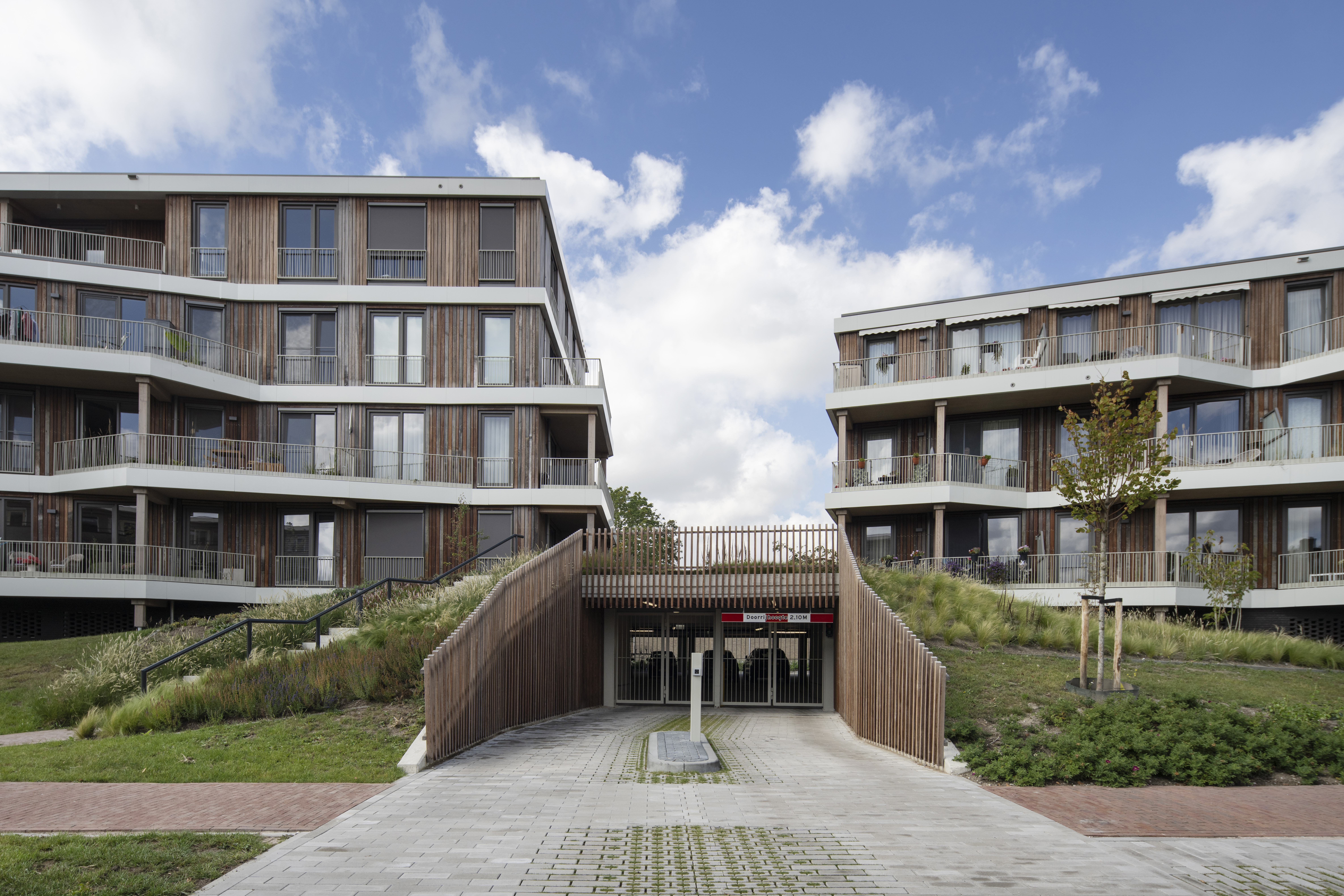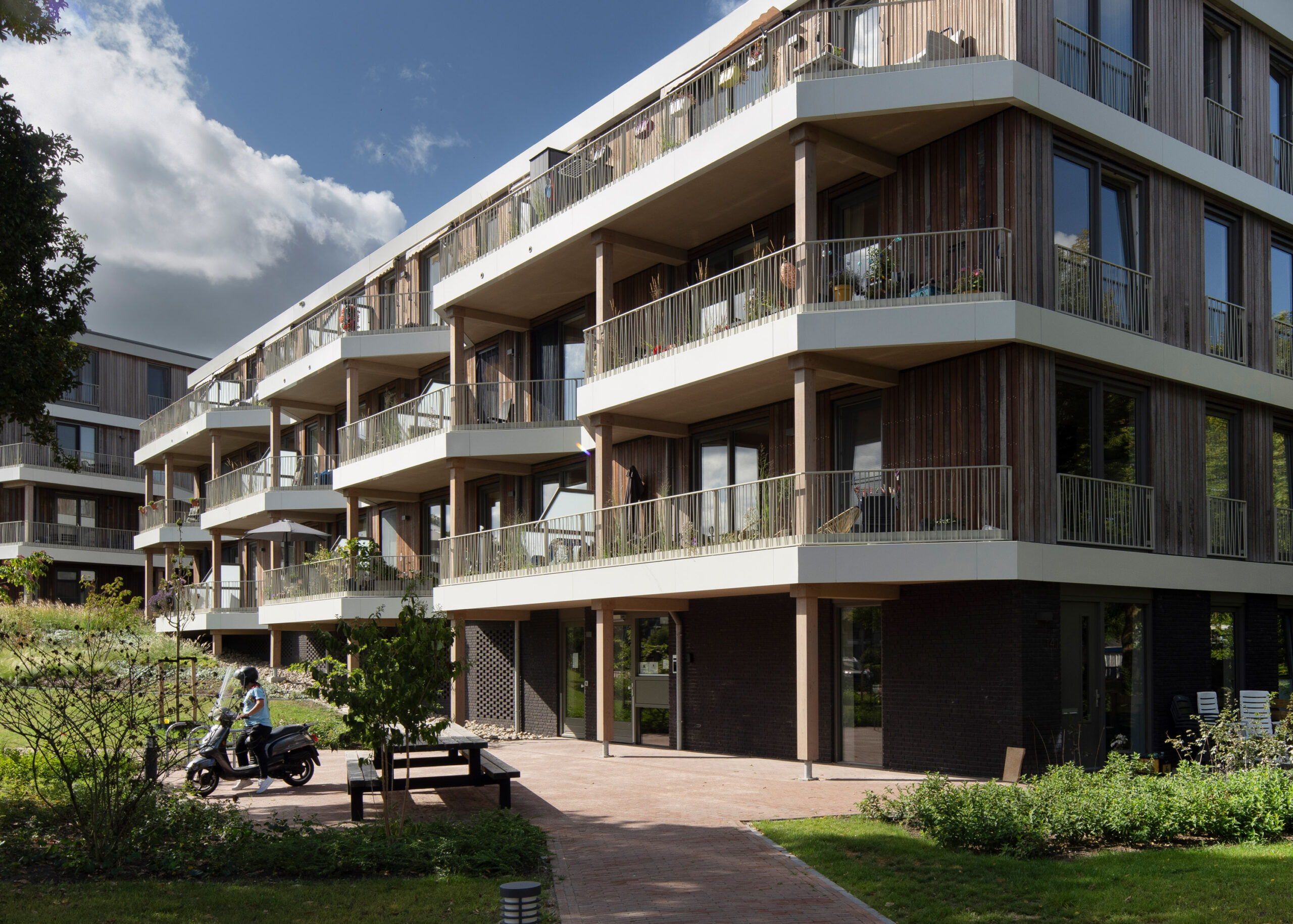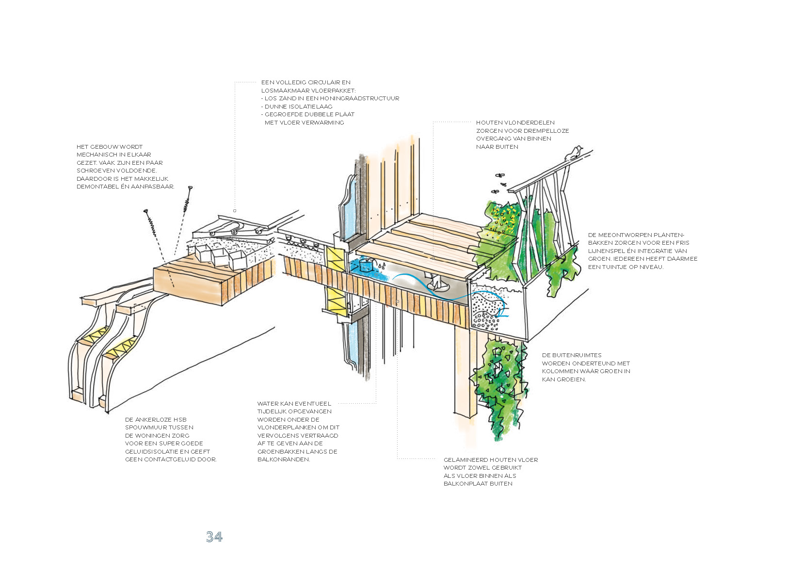 De circulariteit en duurzaamheid in het plan worden visueel zichtbaar door het gebruik van houten gevels en vloeren en de integratie van groen in de gevel.