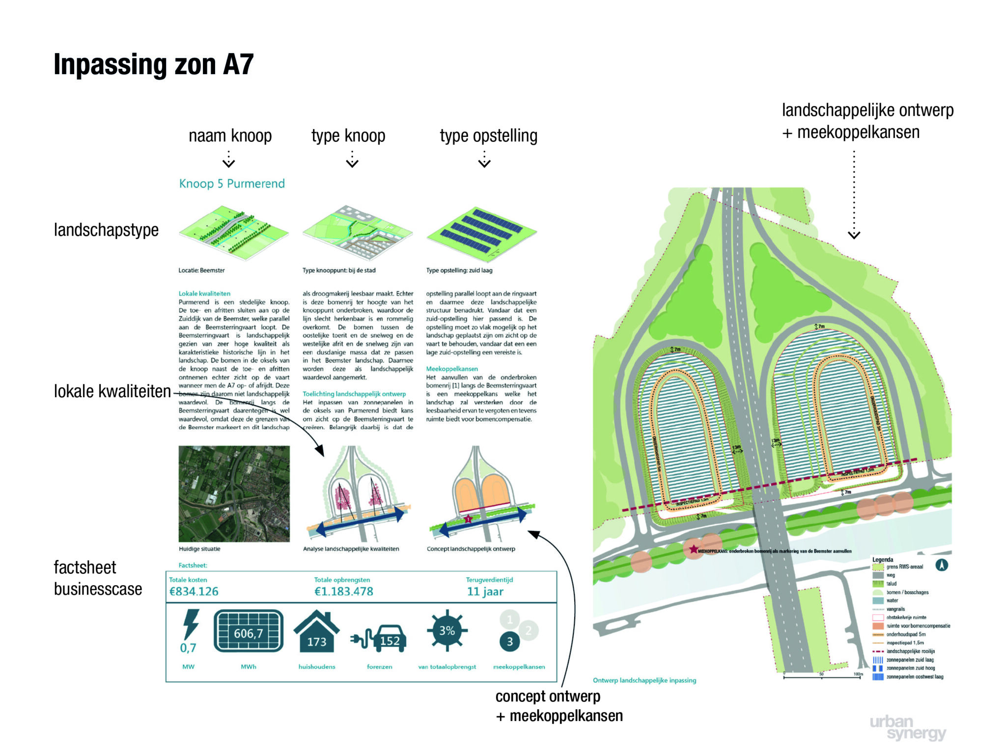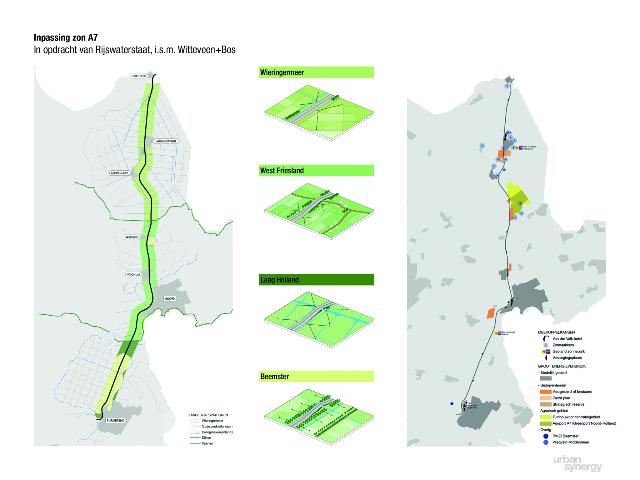 De vraag vanuit Rijkswaterstaat was om uit te zoeken wat de opwekpotentie is van zonne-energie langs de A7 tussen Purmerend Zuid en Den Oever in een integraal landschappelijk ontwerp. Een opdracht voor Urban Synergy en Witteveen+Bos voor het onderzoeken van de mogelijkheden op het Rijkswaterstaatareaal, met als uitgangspunt de huidige stand van de techniek en de kernwaarden van het omliggende landschap.